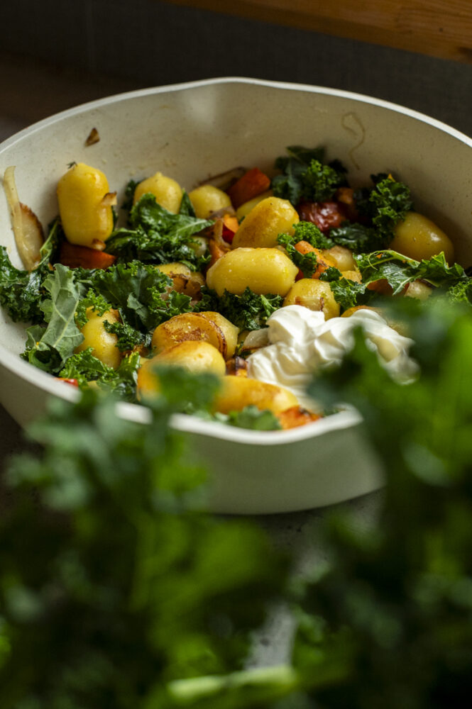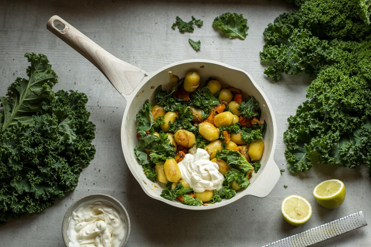 Für mich ist die Grünkohlwoche weit mehr als eine saisonale Aktion. Es geht um Bewusstsein für regionale Erzeugung, für saisonale Küche – und um einen Genuss, der gleichzeitig bodenständig und kreativ sein kann. Genau das möchte ich mit meinem folgenden Rezept zeigen: Eine Kombination von geröstetem Kürbis, Grünkohl, Gnocchi und frischer Zitrone – so schmeckt Herbst. Wenn du Lust auf noch mehr Grünkohl-Inspiration hast, schau dir auch meine bisherigen Rezepte an – zum Beispiel meine Mediterrane Grünkohl-Pasta oder die wärmende Ribolitta mit Grünkohl. Beide zeigen, wie vielseitig dieses wunderbare Gemüse sein kann – von herzhaft mediterran bis hin zu klassisch italienisch inspiriert.